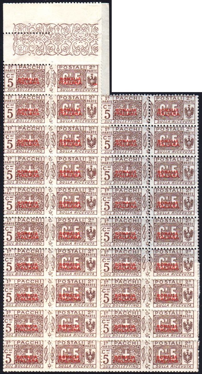 PACCHI POSTALI 1926 - 5 cent. soprastampa rossa del I tipo (43), non emesso, blocco di 19 esemplari, gomma integra, perfetto. Molto freschi.