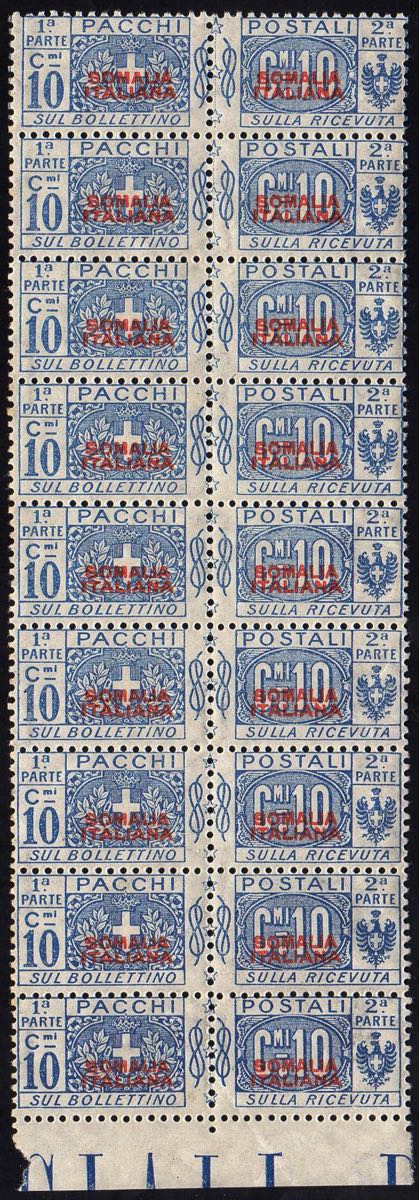 PACCHI POSTALI 1926 - 10 cent. soprastampa rossa, I tipo, non emesso (44), striscia di 9, gomma integra, perfetta. Bella!