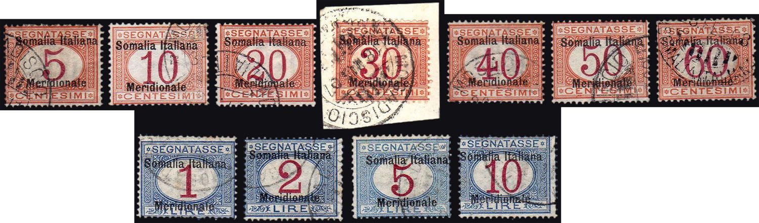 SEGNATASSE 1906 - Soprastampati "Somalia Italiana Meridionale" (1/11), usati, perfetti. Alti valori Em. ed A.Diena, Mezzadri e cert. Ferrario.