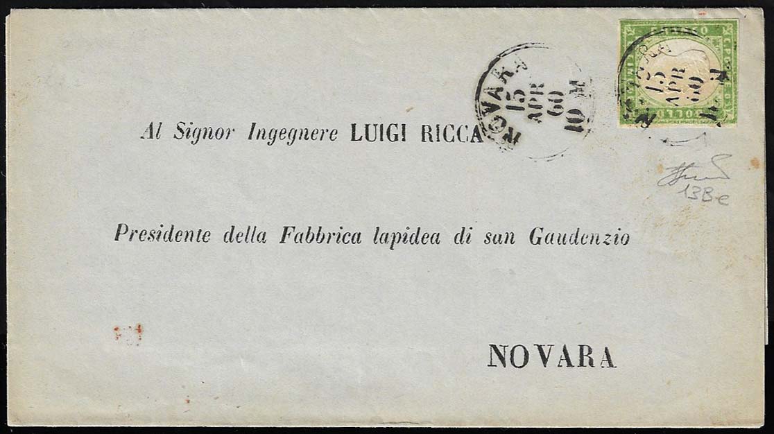 1860 - 5 cent. verde giallo (13Be), giusto in alto a destra, isolato su circolare da Novara 15/4/1860 per città. Raro. Cert. Ferrario.