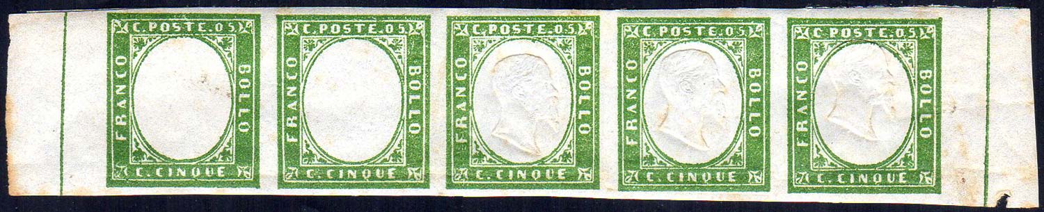 1863 - 5 cent. verde (13Ea), striscia orizzontale di cinque con margini non tosati mostranti le linee di riquadro verticali, i primi due esemplari senza effigie, lieve piega su due esemplari. Molto rara! A. ed E.Diena.