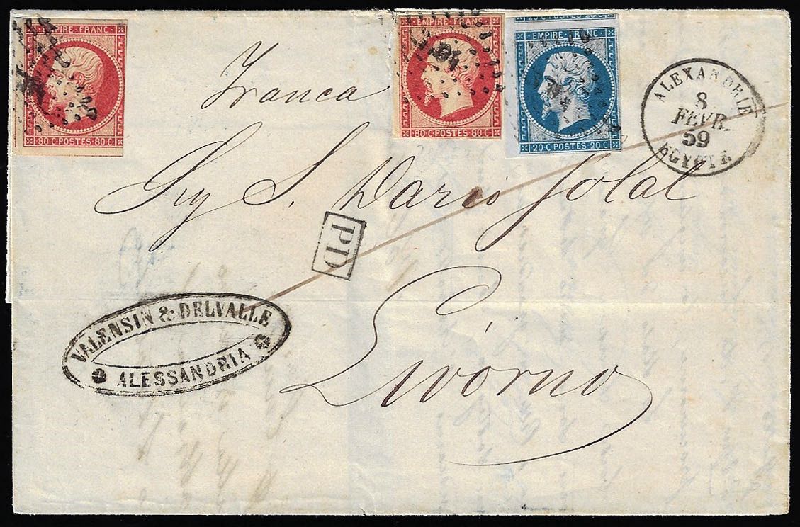 FRANCIA 1859 - 20 cent., 80 cent., due esemplari Napoleone III (14,17), difetti di marginatura, su lettera dall'ufficio postale francese di Alessandria d'Egitto 8/2/1859 a Livorno.