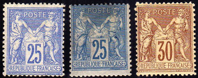 FRANCIA 1876 - 25 cent., un esemplare oltremare e uno azzurro, 30 cent. Sage, II tipo (78,79,80), gomma originale, perfetti.