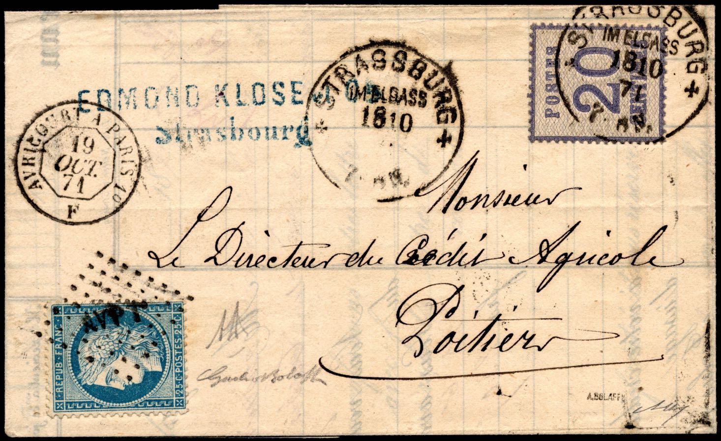 FRANCIA OCC. TEDESCA ALSAZIA E LORENA 1871 - 20 cent. (6), in affrancatura mista con 20 cent. di Francia, perfetti, su lettera da Strassburg 18/10/1871 a Poitiers, con il francobollo francese annullato con il timbro a stella di punti AVP 1°. Molto bella! A.Diena, G.Bolaffi.