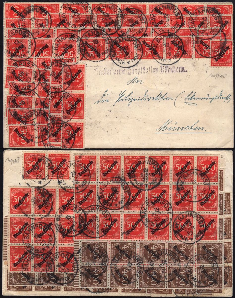 GERMANIA REICH 1928 - Eccezionale busta affrancata recto/verso con 63 esemplari del 40 m e 100 del 500 m soprastampati (53/54), da Bay. Bahnpost 13/9/1928 a Monaco. Spettacolare e unica! Dal certificato Caffaz "…spettacolare affrancatura di 163 esemplari, il più alto numero del genere a me noto…".