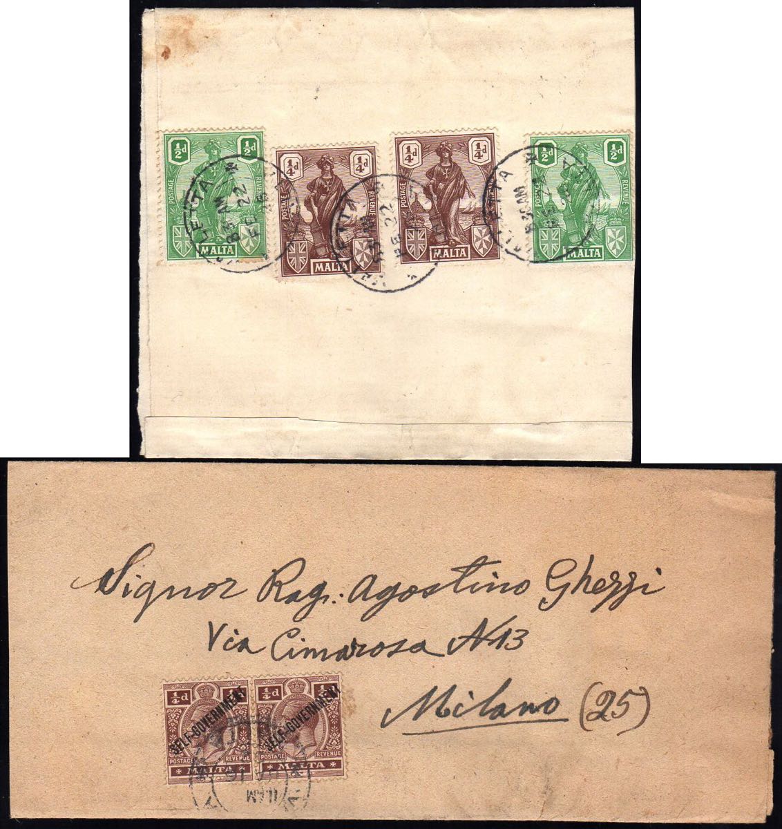 MALTA 1916/1922 - Due fascette affrancate rispettivamente con 1/4 p. soprastampato, coppia (66), e con 1/4 p.e 1/2 p. Allegorie, entrambi due esemplari (84,85), entrambe da La Valletta per Milano.