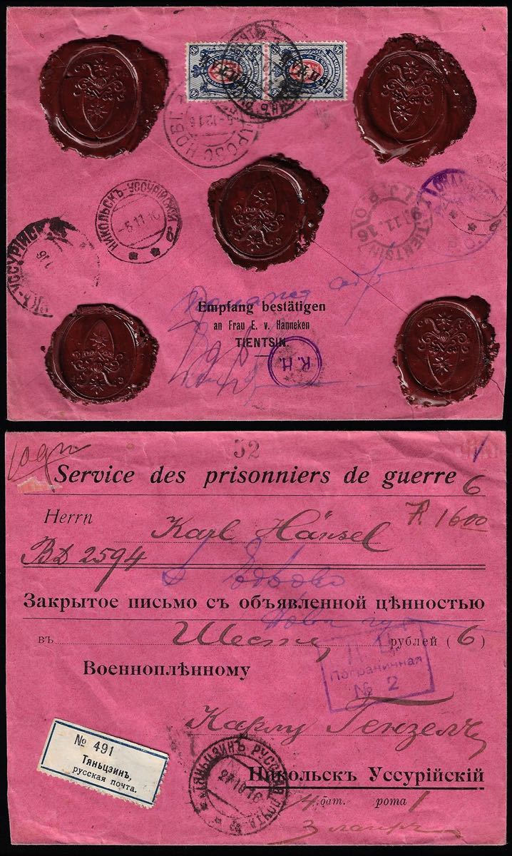 RUSSIA UFF. POSTALI IN CINA 1916 - 14 k. soprastampato "Kitaj" in nero (27), coppia, perfetta, al verso di lettera assicurata del "Servizio dei prigionieri di guerra" da Tientsin diretta in Russia. Rara. Cert. SPR.