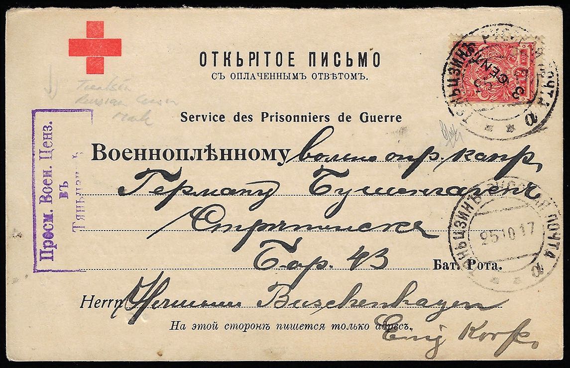 RUSSIA UFF. POSTALI IN CINA 1917 - 3 cent. su 3 k. (38), perfetto, isolato su cartolina del servizio prigionieri di guerra della Croce ... Leggi tutto