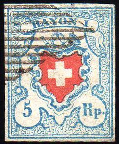 Lotto 2491 - SVIZZERA 1851 - 5 r. azzurro chiaro e rosso (20), usato, ...