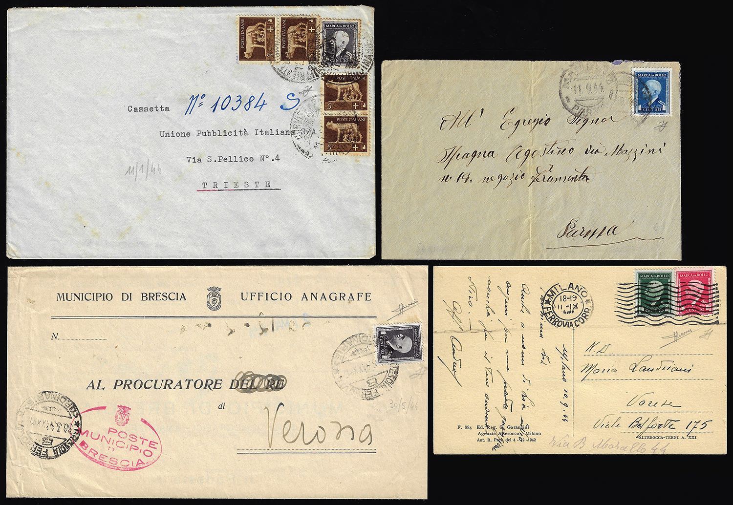REPUBBLICA SOCIALE ITALIANA 1944 - Quattro buste affrancate in emergenza con marche da bollo di Regno. Interessanti e firmate Ferrario/Sorani.