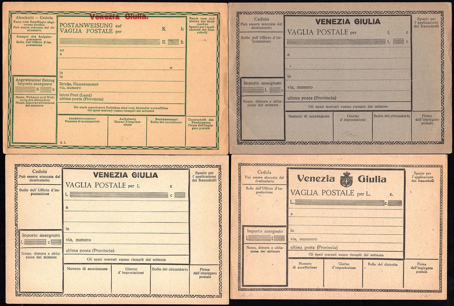 OCCUPAZIONE ITALIANA VENEZIA GIULIA 1921 - Quattro bollettini per vaglia postali nuovi diversi.