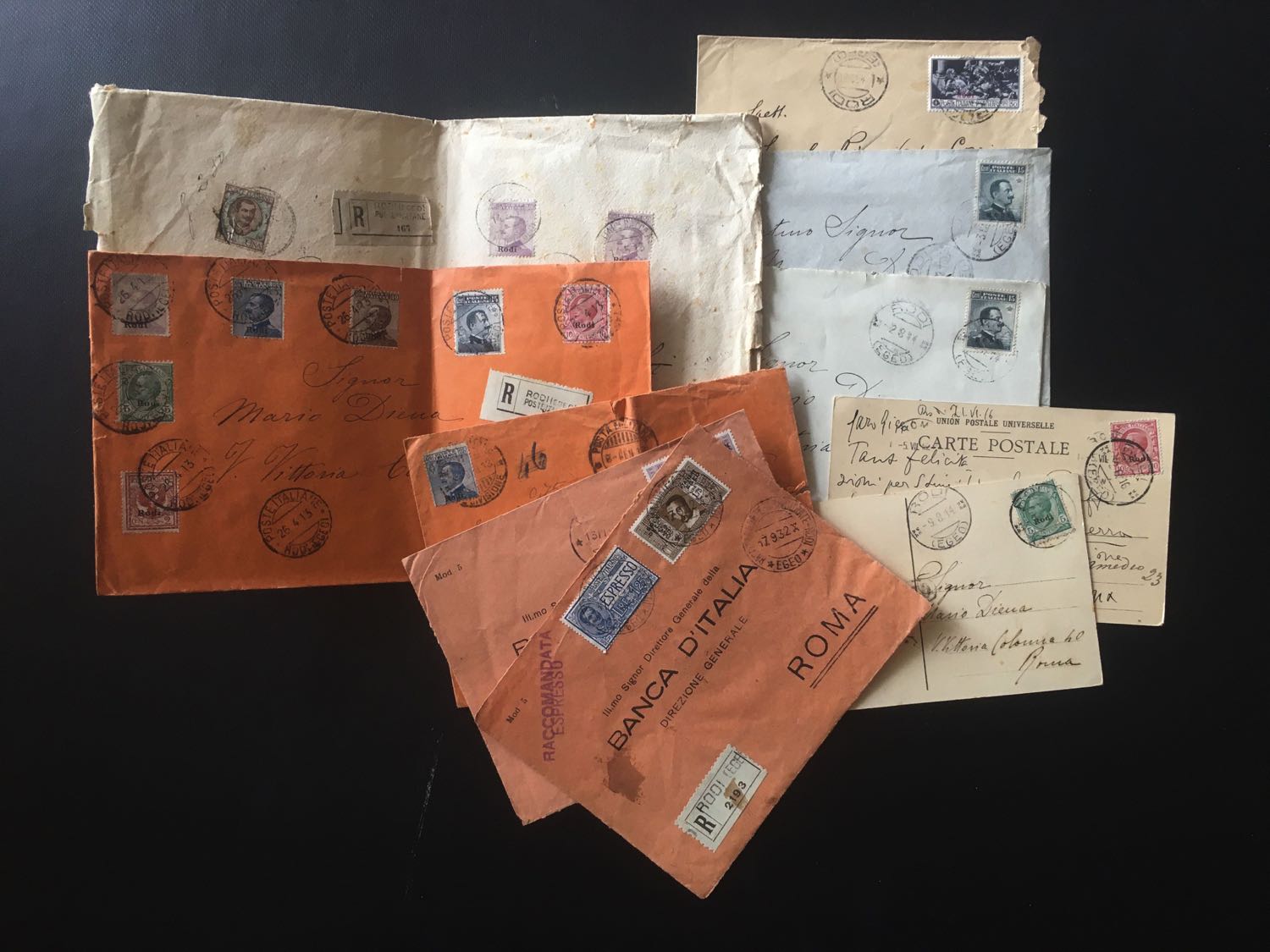 EGEO RODI 1913/1935 - Lotto di sette lettere, un frontespizio e due cartoline, con affrancature anche rare del periodo.