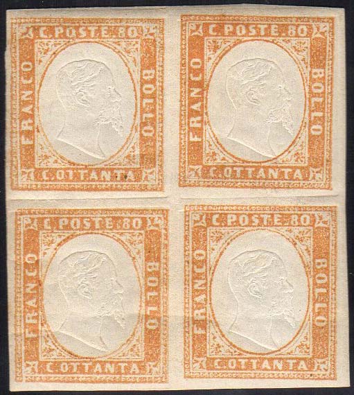 Lotto 963 - 1858 - 80 cent. bistro arancio (17), blocco di quattro, ...